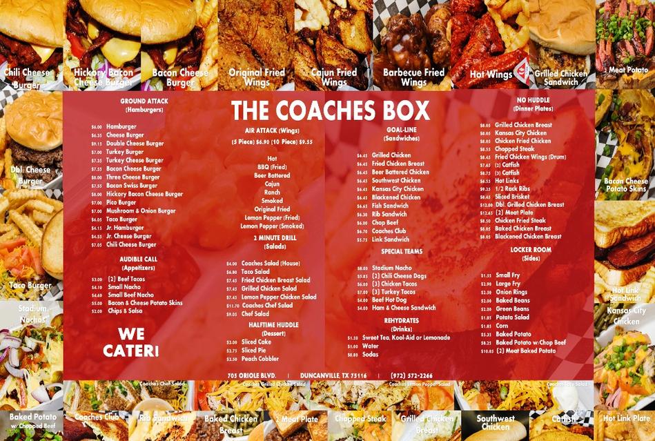 As we kept driving around, we found a tannish cafe by the name of The Coach’s Box. I remember the outside of the cafe had pictures of all the foods they serve. There was a burger, fried wings, catfish, baked chicken breast, barbecue links, baked potato, tacos, etc. My best friend and I eyes lit up because it was new and had many items for us to chose from. As we walked in, we were greeted by a sweet woman who asked us if we wanted to dine in or carry out. We didn’t have anything planned for later on, so we sat down and enjoyed the service.